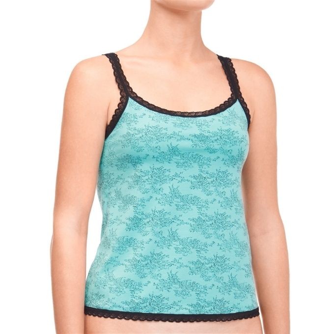 Майка женская из эластичного трикотажного хлопкового полотна с лайкрой, силуэта трапеция. Бретель, срез горловины, проймы, срез низа изделия обработаны узким отделочным кружевом.