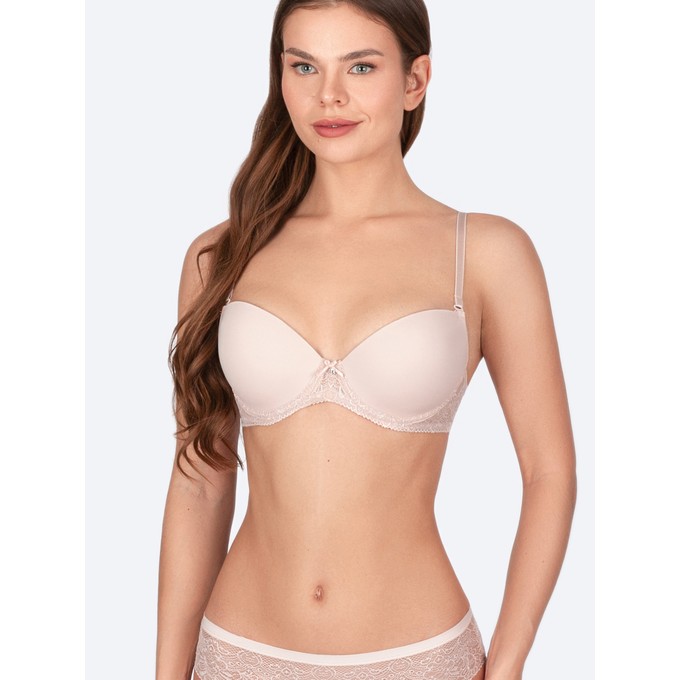 Определить размерБюстгальтер пуш-ап на каркасах, чашки формованные, со съемными бретелями. Стан выполнен из эластичного кружева, лицевая сторона чашек - из гладкого эластичного полотна. Изнаночная сторона чашек выполнена из хлопка. Мягкая изнаночная сторона тесьмы и бретелей. Декор: бантик с украшением.