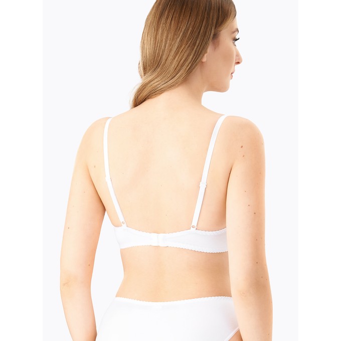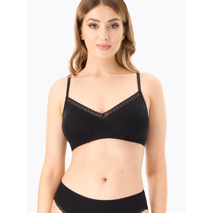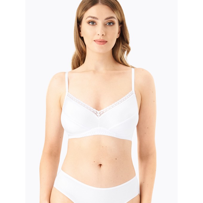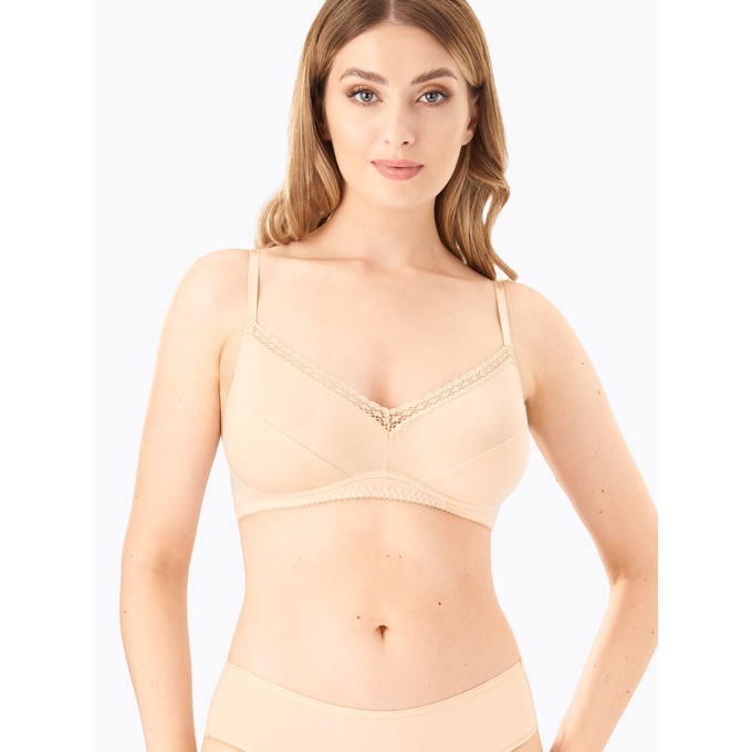 Определить размерБюстгальтер с мягкими чашками без каркасов. Чашка с двойным диагональным членением. Изделие выполнено из натурального хлопка с лайкрой. Отделка по верхним срезам чашек из эластичного узкого кружева. Мягкая изнаночная сторона тесьмы и бретелей.