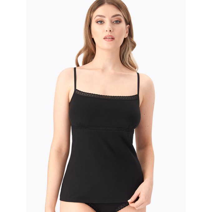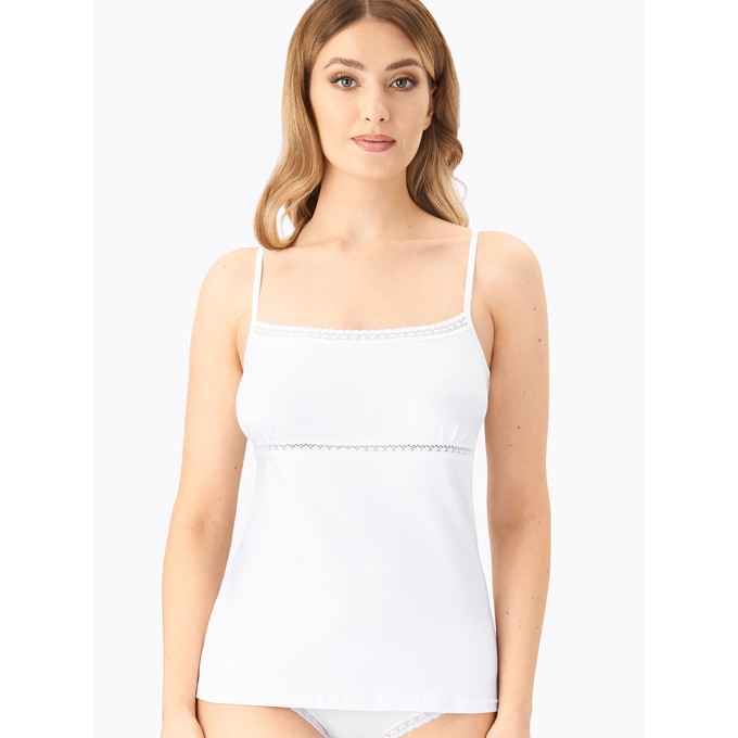Определить размерМайка из натурального хлопка с лайкрой, прилегающего силуэта. Узкие бретели из мягкой эластичной ленты. Подрез передней детали подчеркивает линию груди. Отделка по верхним срезам переда и спинки из эластичного узкого кружева.
