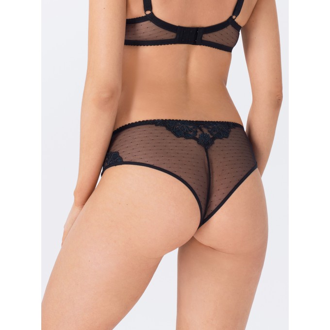 Определить размерБразильяно из эластичной сетки в горошек со средней линией талии. Отделка переда и спинки: вышивка. Передняя часть цельнокроена с ластовицей из натурального хлопка с лайкрой. Узкая эластичная лента по линии бедер настрочена незаметным плоским швом. Мягкая эластичная тесьма по линии талии.