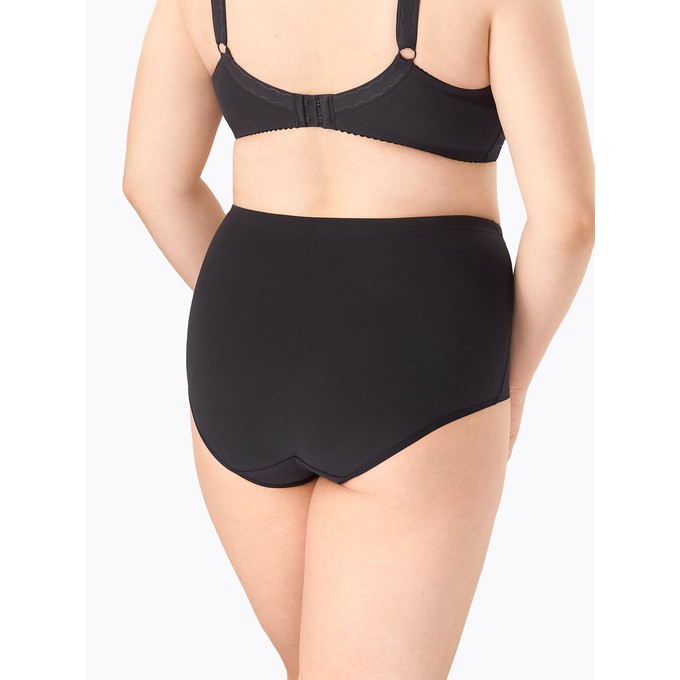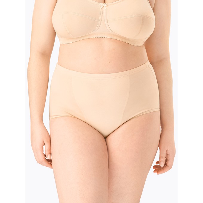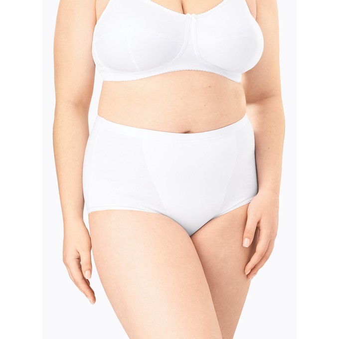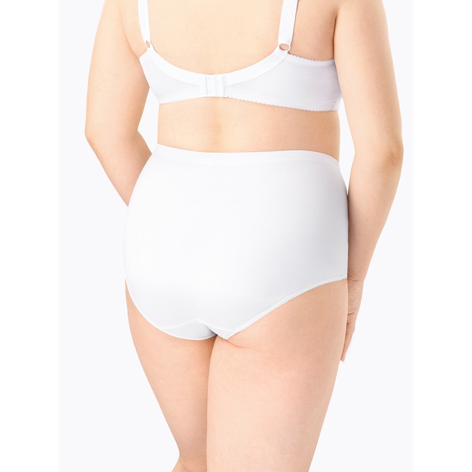 Трусы из натурального хлопка с лайкрой с высокой линией талии. Дополнительный уплотнитель из хлопка корректирует область живота. Мягкая эластичная лента по талии. Ластовица и узкие эластичные ленты по бедрам настрочены незаметным плоским швом.